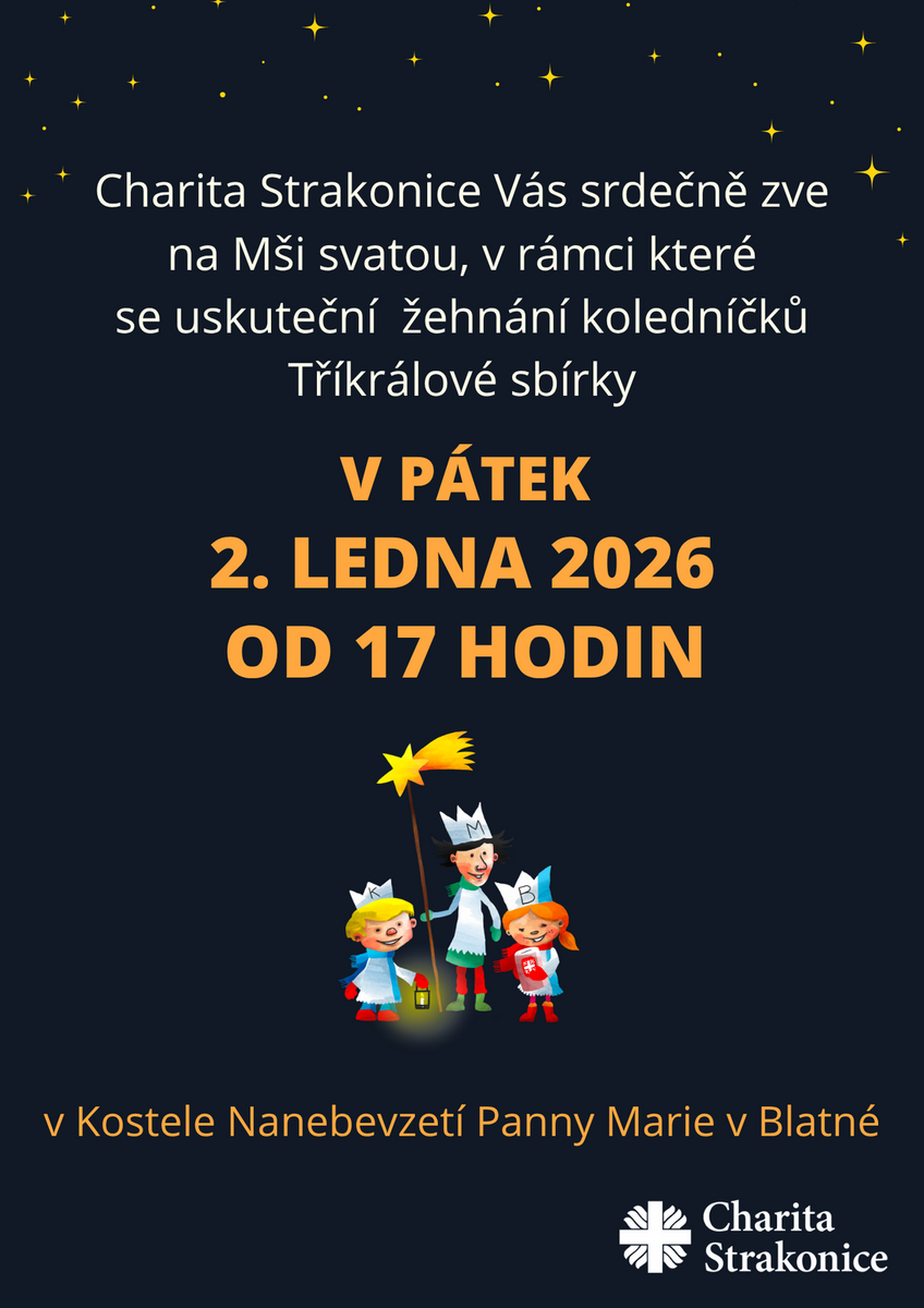 Zveme vás v pátek 2. 1. 2026 od 17 hodin do Kostela Nanebevzetí Panny Marie v Blatné, kde při mši svaté slavnostně vyšleme koledníčky Tříkrálové sbírky.